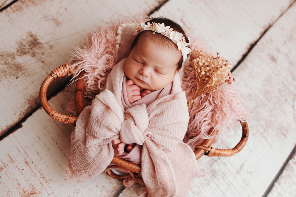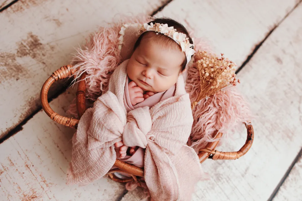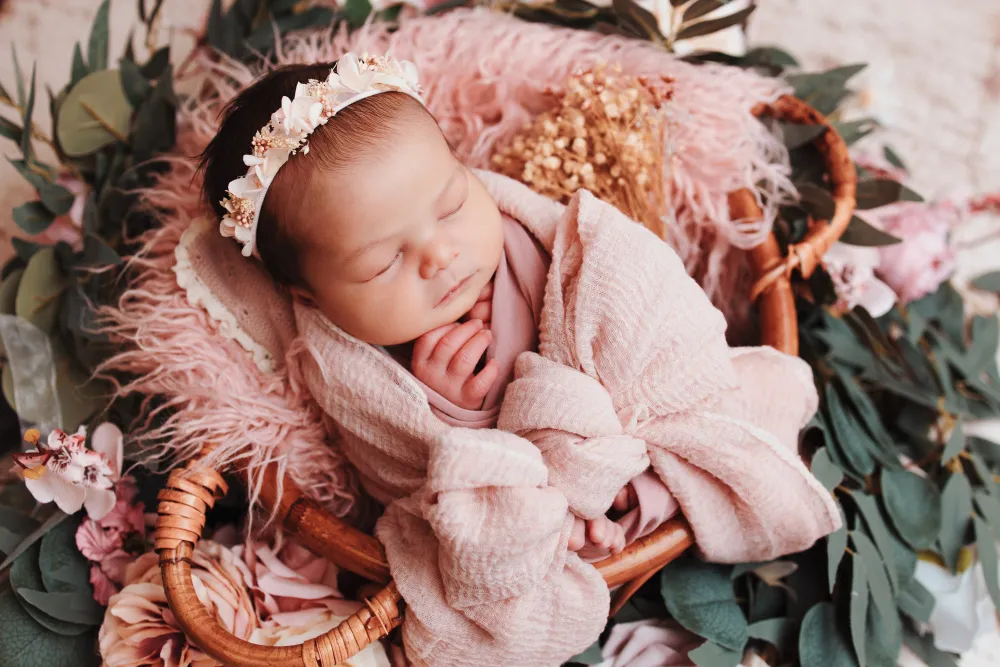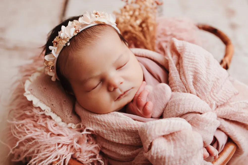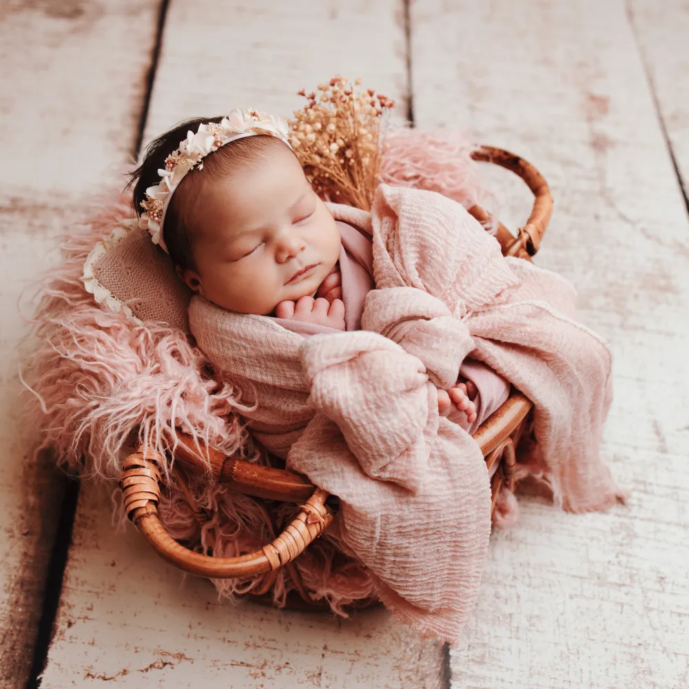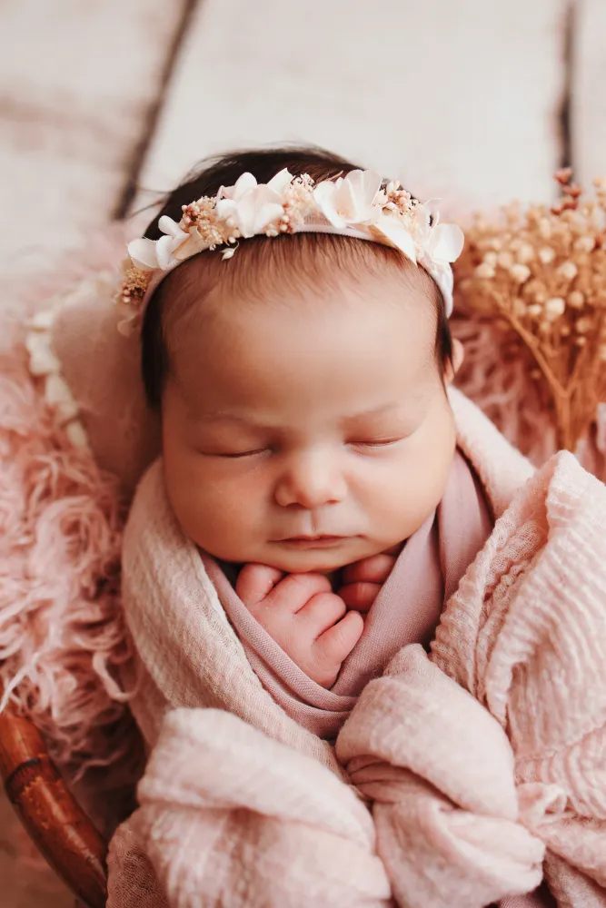 Chaque shooting nouveau-né à Besançon est pensé avec soin. Le studio est décoré avec des matières naturelles, des tons doux et parfois de légères touches fleuries pour créer une ambiance chaleureuse et intemporelle.