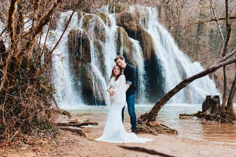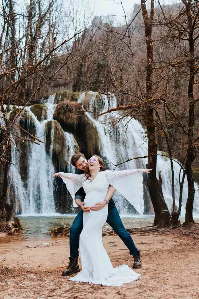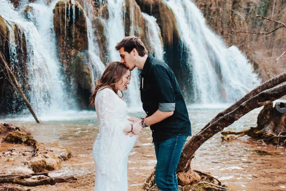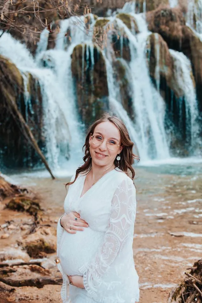 Offrez-vous un moment magique et inoubliable avec un shooting grossesse en pleine nature, au cœur de la magnifique Cascade des Tufs à Arbois