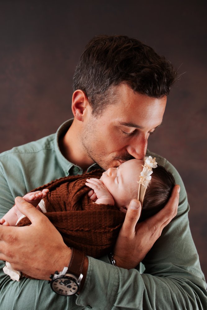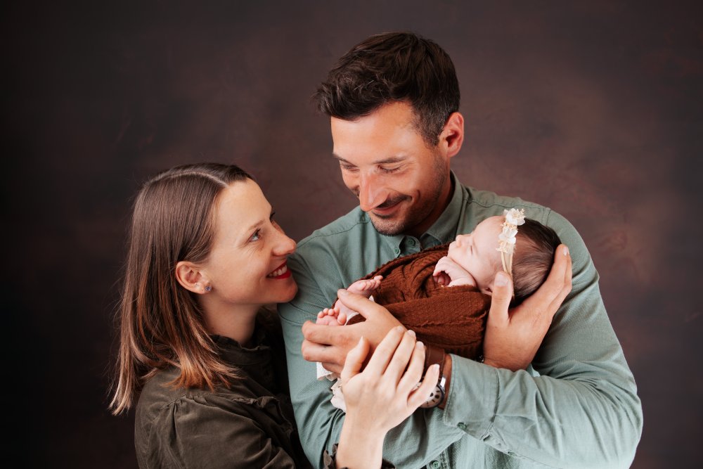 Shooting photo nouveau né avec enmmaillotage et photos de famille en studio à Besançon
